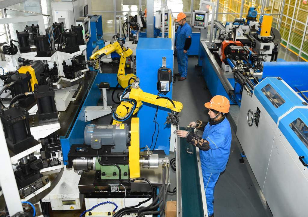 2月14日,浙江省湖州市吴兴区的一家企业,工作人员和智能机器人协作生产不锈钢管件。新华社记者 翁忻旸 摄