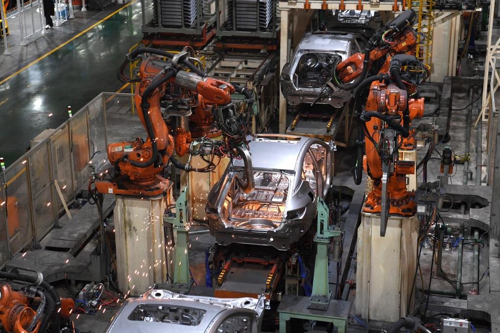 工业机器人在江淮汽车乘用车焊接车间生产线上工作(2月22日摄)。新华社记者 刘军喜 摄